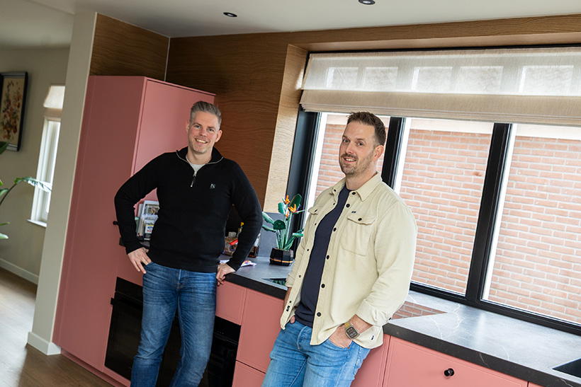 “Sommigen zeggen dat het lijkt alsof je te veel gedronken hebt, dat je ervan gaat wankelen”, lacht Harmen. “Nou, valt mee hoor. Ik vond het leuk om iets aparts te doen. Vandaar misschien ook onze roze keuken, dat zie je ook niet vaak.” We mogen vandaag binnen kijken bij Niels Wessels en Harmen Lageweg. Het stel trouwde drieënhalf jaar geleden en zocht een plek om te settelen. “Iets buitenaf, dat wilden we graag”, vertelt Harmen. Hij komt uit Joure en is ‘thuis’ in Heino sinds hij als meester op de basisschool werkte. “Maar we kwamen er niet uit. Dit huis? Nee, da’s niks, zei Niels, geen vrij uitzicht achter. Maar toen we een tweede keer langskwamen hebben we stiekem achter het huis gegluurd, hmmm, toen waren we om.” Voor Niels voelt het vertrouwd. Hij groeide in Heino op, zijn ouders woonden ooit twee huizen verderop. “Voor mij is de cirkel rond”, zegt hij. Lang verhaal kort. Ze kochten de vrijstaande woning uit 1955. Al moest er wel wat gebeuren. Onderhoud. Vernieuwen. “De schouw wilden we eruit hebben, dan kom je ook aan het dak, waar asbest in zat”, vertellen ze. “We moesten isoleren. Bij de binnenmuren? Dat kostte ruimte. We wilden juist uitbreiden, maar hoe?” Kortom, veel plannen, veel problemen en de conclusie was, álles moest op de schop. Groots. Het dak ging eraf, letterlijk en figuurlijk. De verbouwing duurde bijna een jaar. Het nieuwe dak kwam twee meter omhoog zodat de zolderverdieping ook een volwaardige leefruimte is geworden. De bovenverdieping groeide in hoogte en omvang. Er is een grote overloop, een slaapkamer, een kantoor, een logeerkamer en een ruime badkamer. De vlizotrap werd vervangen door een vaste trap naar de opgehoogde zolderverdieping.